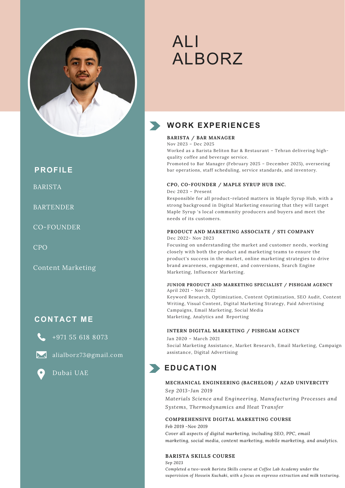 • آماده‌سازی حرفه‌ای منوی بار گرم و سرد با تمرکز بر کیفیت عصاره‌گیری و لاته آرت.