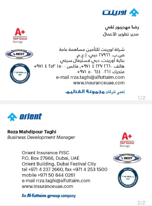 من رضا مهدیپور، نماینده رسمی Orient Insurance (گروه Al‑Futtaim) هستم. خدمات مشاوره و ارائه انواع بیمه در امارات شامل موارد زیر است: بیمه درمانی کامل با پوشش ویژه برای بیمارستان ایرانیان و دسترسی به شبکه معتبر بیمارستانهای امارات، بیمه خودرو، بیمه عمر و طرحهای سرمایهگذاری، بیمه مسافرتی، پوششهای شرکتی و مسئولیت، و طرحهای گروهی برای کارکنان از جمله workers compensation. مشاوره برای یافتن پوشش مناسب رایگان است. برای راهنمایی مستقیم و استعلام هزینه کافی است از طریق واتساپ پیام دهید: +971 50 644 0261