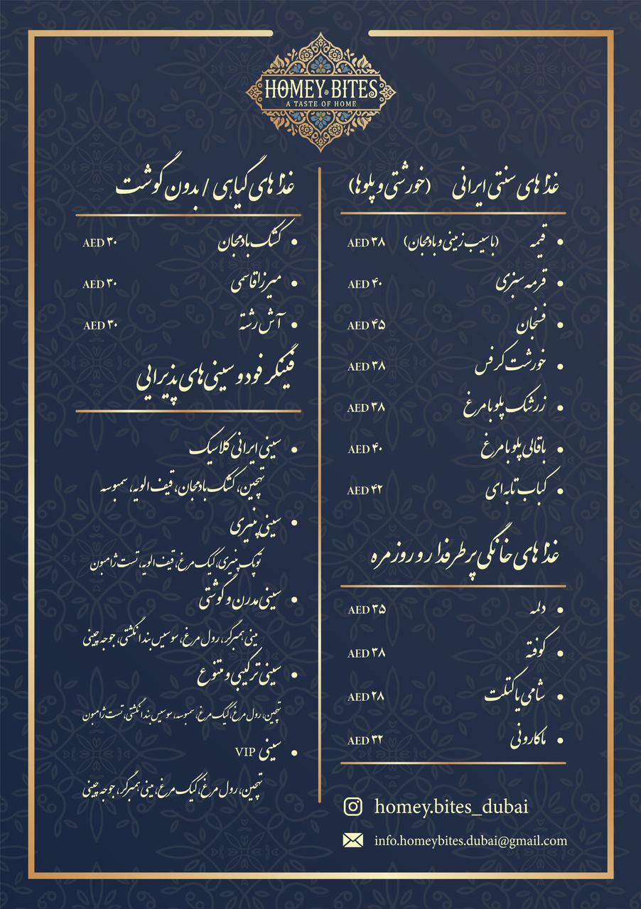 Homey Bites در دبی ارائهدهنده غذاهای خانگی اصیل ایرانی است که با عشق و کیفیت بالا پخته میشوند. تمامی غذاها به سبک سنتی و با مواد اولیه تازه تهیه شده و طعمی دقیقاً شبیه غذای مامان دارند. این مجموعه گزینهای عالی برای افرادی است که به دنبال تجربه غذای ایرانی خانگی در امارات هستند. با منوی متنوع شامل خورشتها، کبابها و برنج زعفرانی، Homey Bites حس نوستالژی و گرمای خانه را به سفره شما میآورد.