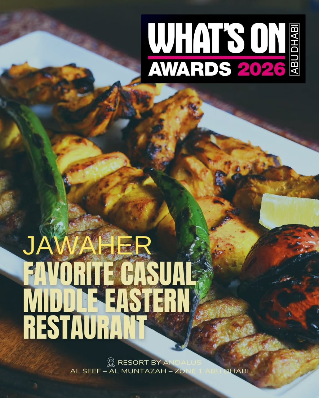 رستوران جواهر یکی از رستورانهای معتبر در ابوظبی است که با طراحی خاص، فضای مجلل و منوی متنوع عربی و ایرانی شناخته میشود. این مجموعه برنده جایزه "Travellers’ Choice 2025" و مورد تقدیر Whatson 2025 بوده و در لیست بهترین رستورانهای MENA توسط Timeout Abu Dhabi قرار گرفته است.