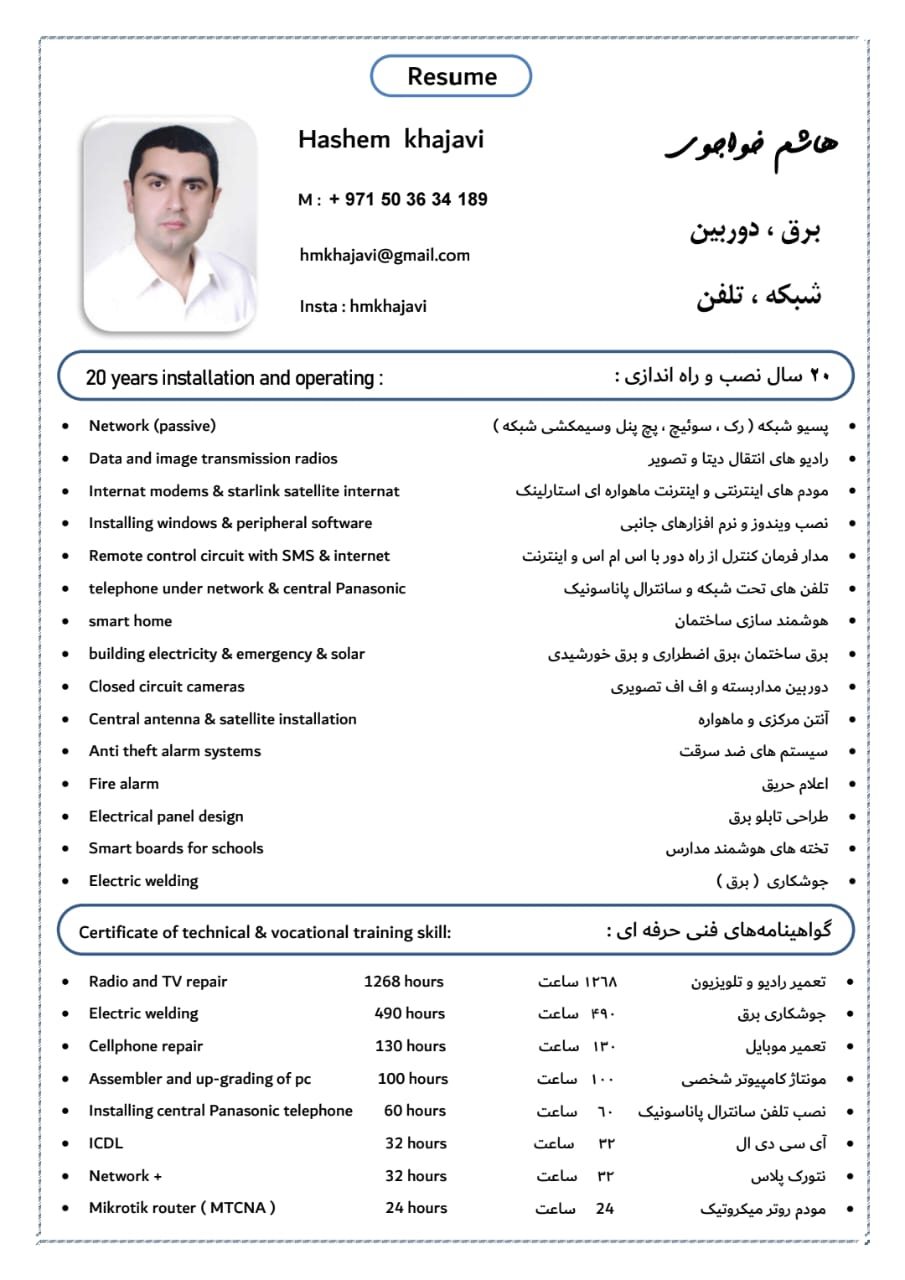 هاشم خواجوی، همکاری در زمینههای برق، شبکه، دوربینهای مداربسته و سیستمهای تلفن (به همراه تجهیزات کامل نصب و راهاندازی)