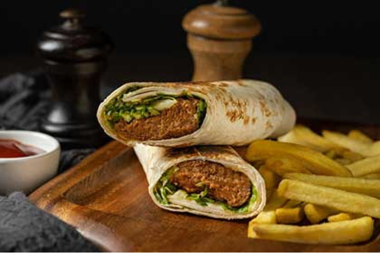 نان تورتیلا با هوموس و کاهوی تازه با سیب زمینی سرخ کرده