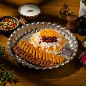 فیله سالمون کاملاً کبابی. با سالاد خوشمزه شیرازی و سس مخصوص سرو می شود..