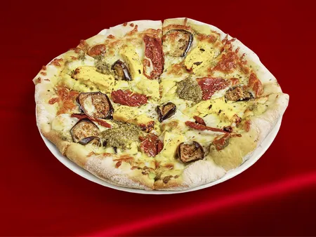 سس پستو خامهای، گوجهفرنگی خشکشده در آفتاب، مرغ گریلشده، پنیر ذوبشده و سبزیجات برشتهشده.