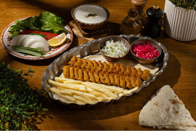 کباب چرخ کرده با سیب زمینی سرخ کرده، ماست و سالاد سبز سرو می شود.
