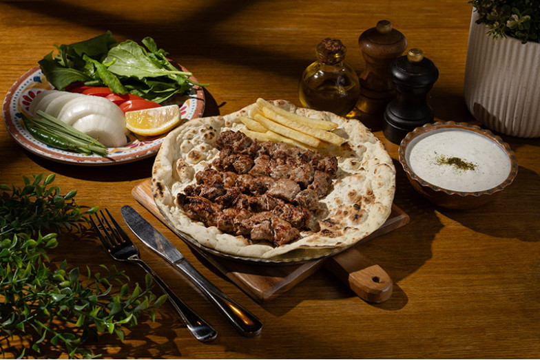 یک بشقاب حاوی 5 سیخ گوشت تیکا با سالاد سبز + ماست خیار + نان ایرانی
