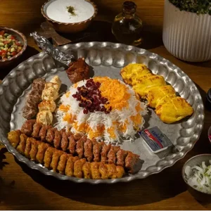 یک بشقاب گریل مخلوط حاوی 9 سیخ سیخ گوشت و مرغ است که با 2 سالاد سبز و 2 یوگ خیار سرو می شود.