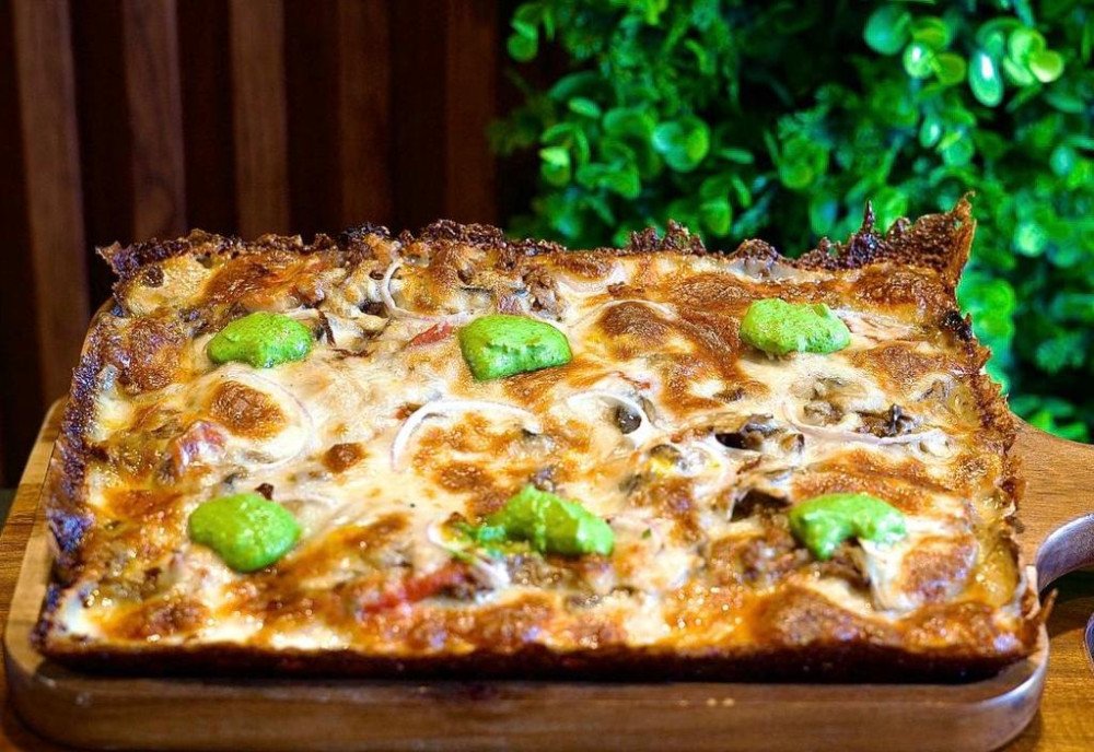 دنده گوشت گاو، قارچ، گوجه فرنگی سس، پیاز، پنیر موزارلا و چدار، سس جعفری