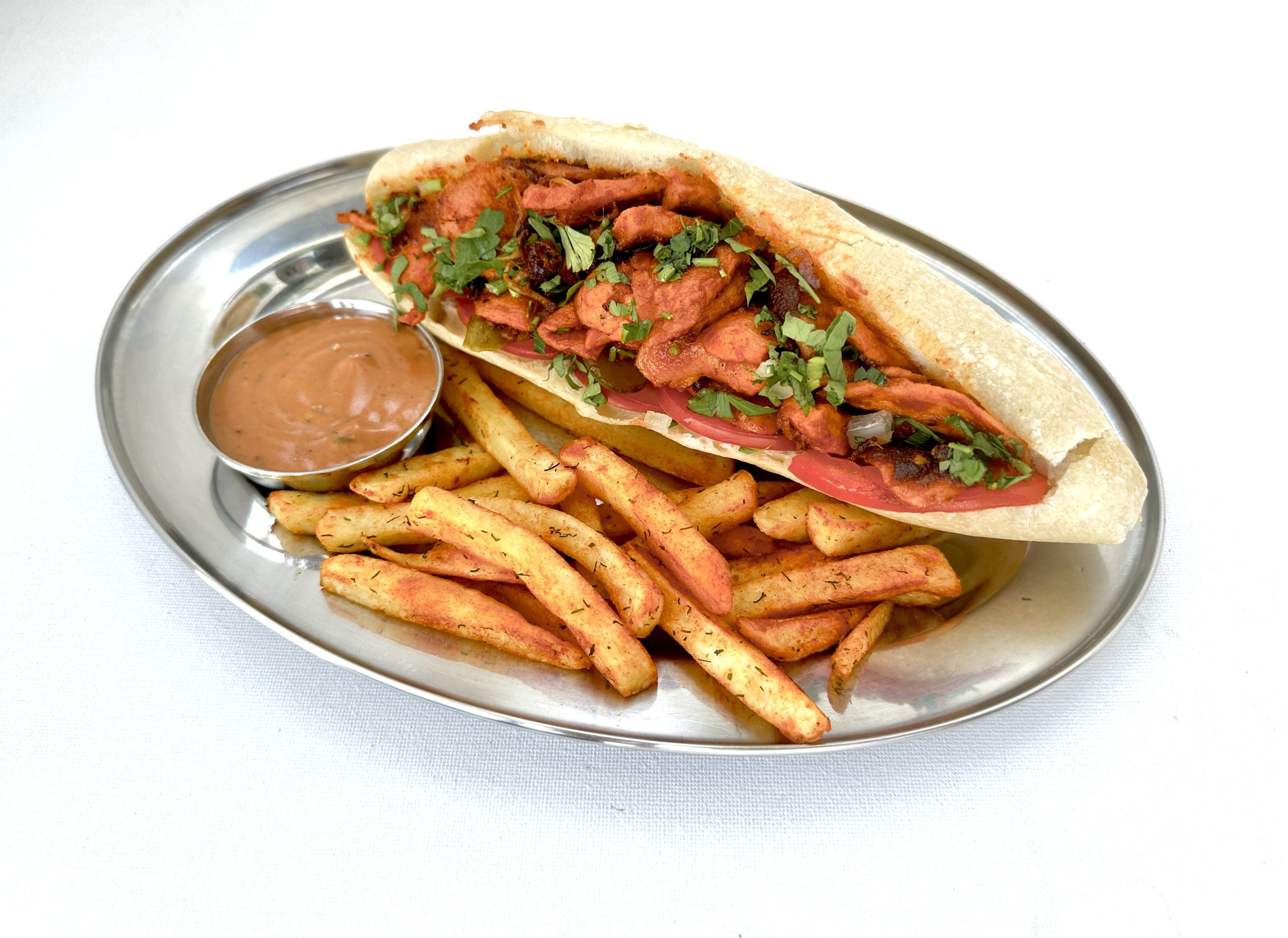 سوسیس، سس گوجه فرنگی، کاراملی پیاز، خیار شور، گوجه فرنگی، پیاز جعفری