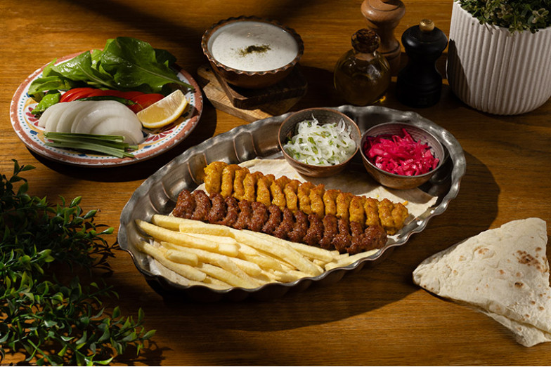 کباب مخلوط با سالاد سبزیجات و ماست و نان سرو می‌شود.