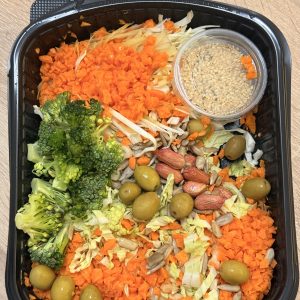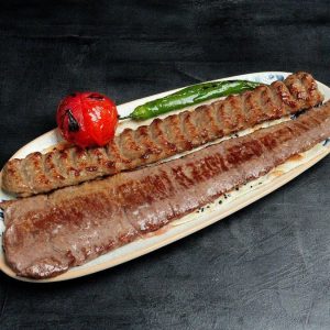 یک بشقاب شامل ۵ سیخ گوشت تیکه به همراه سالاد سبزیجات + ماست خیار + نان ایرانی
