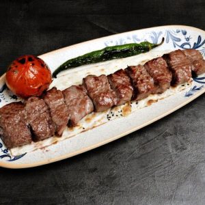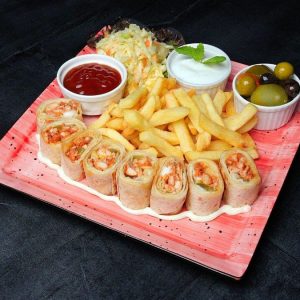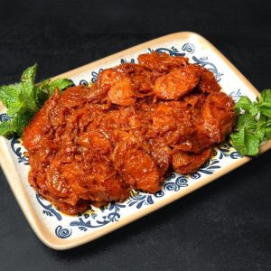 سینه مرغ آبدار مرینیت شده در زعفران. همراه با سیب زمینی سرخ کرده تازه پخته شده و سیب زمینی سرخ کرده سرو می‌شود و در کنار آن یک سالاد سبزیجات خوشمزه و مقداری ماست سرو می‌شود.