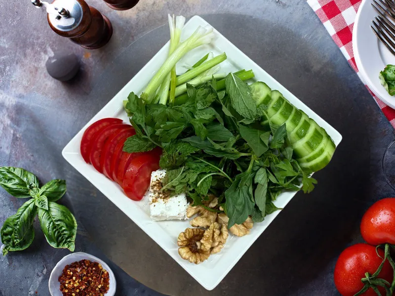 پیازچه-گوجه-خیار-گردو-پنیر-نعنا-ریحان هر آیتم اضافه 5درهم