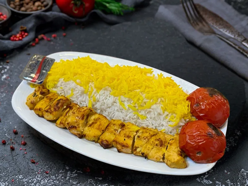 فیله مرغ بدون استخوان، مرینیت شده در زعفران و آبلیمو، سرو شده با برنج زعفرانی و کره