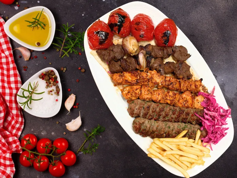 2 سیخ کوبیده ( هر سیخ 80 گرم ) 2 سیخ شیش تاووک ( هر سیخ 75 گرم ) 2 سیخ چنجه ( هر سیخ 75 گرم )
